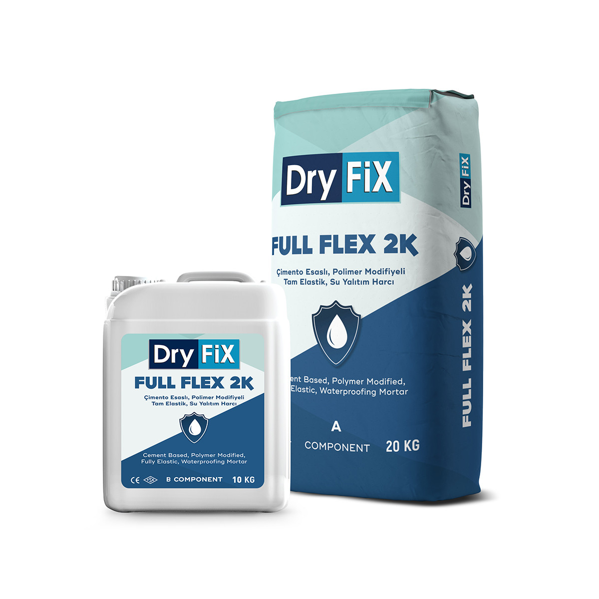 Dryfix Çimento Esaslı Tam Elastik Full Flex 2K polimer modifiyeli, iki bileşenli, kullanıma hazır yalıtım harcıdır. Rayiç No: 10.300.2173. Toz bileşen (A komponent) ve Polimer emülsiyon esaslı (B komponent) sıvı bileşenden oluşan çift komponentli yapıda, tam elastik, seramik döşenmeden önce uygulanarak, su yalıtımı sağlayan bir yalıtım malzemesidir.